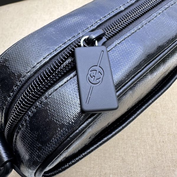 GG クリスタル キャンバスは、スポーツウェアを思わせる雰囲気とコンテンポラリーなテクスチャが特徴的な素材。丈夫で光沢のある表面にアーカイブモチーフを施すことで、最新メンズ コレクションに登場するアイテムをコンテンポラリーな雰囲気に仕上げています。そのひとつであるこのミニ ショルダーバッグは、ブラックのGG クリスタルで仕立てました。