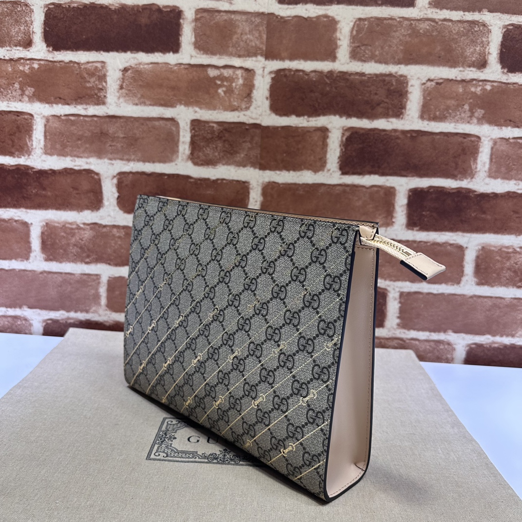 ブランド グッチ 商品名 GG ディテール付き ポーチ サイズ 21X27X7cm 色 ベージュ&エボニー/ダスティピンク シルバー金具 素材 GGスプリームキャンバス/レザー 品番 774345 FACQC 5729 状態 新品 付属品 箱・布袋